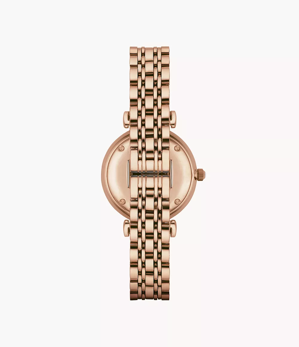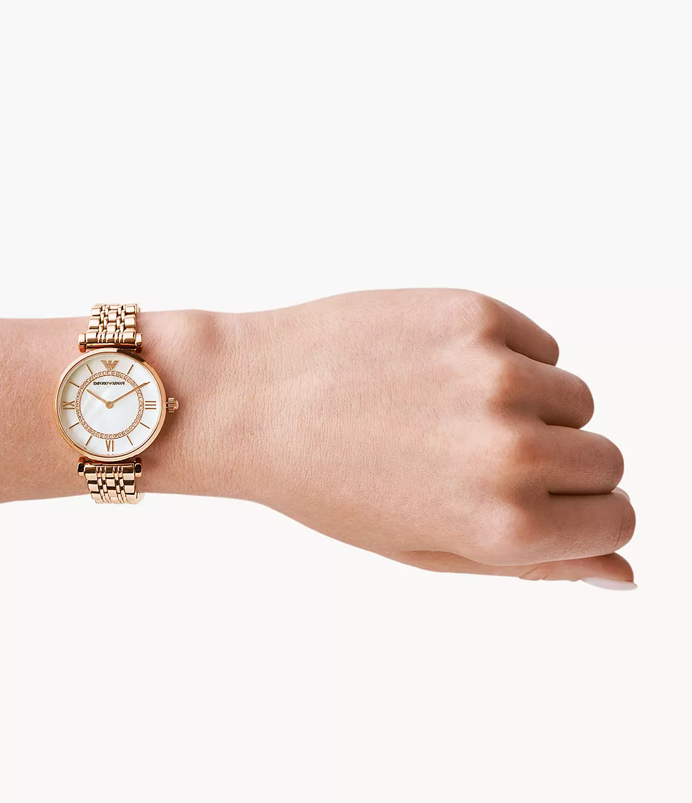 Mother of Pearl Dial. Gem Set. Polished Rose Gold PVD Plated Stainless Steel Hands. Applied Steel Indexes.