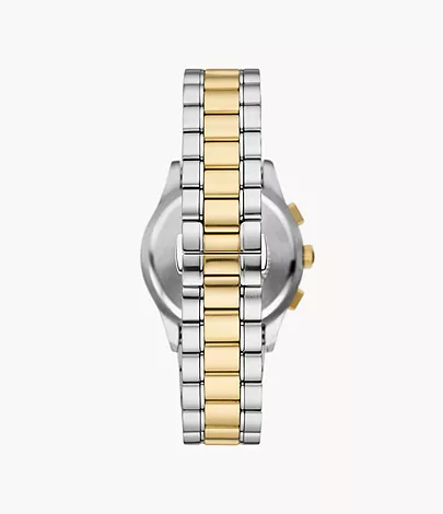 Emporio Armani’s 42mm watch features a grey sunray textured dial, chronograph movement, stainless steel case and two-tone stainless steel bracelet.
