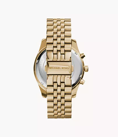 This Michael Kors timepiece features a champagne dial set on a plated steel case. A matching bracelet completes the look.