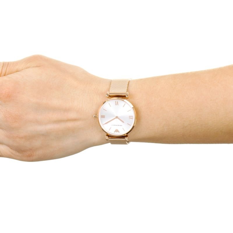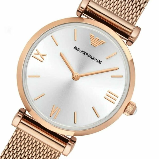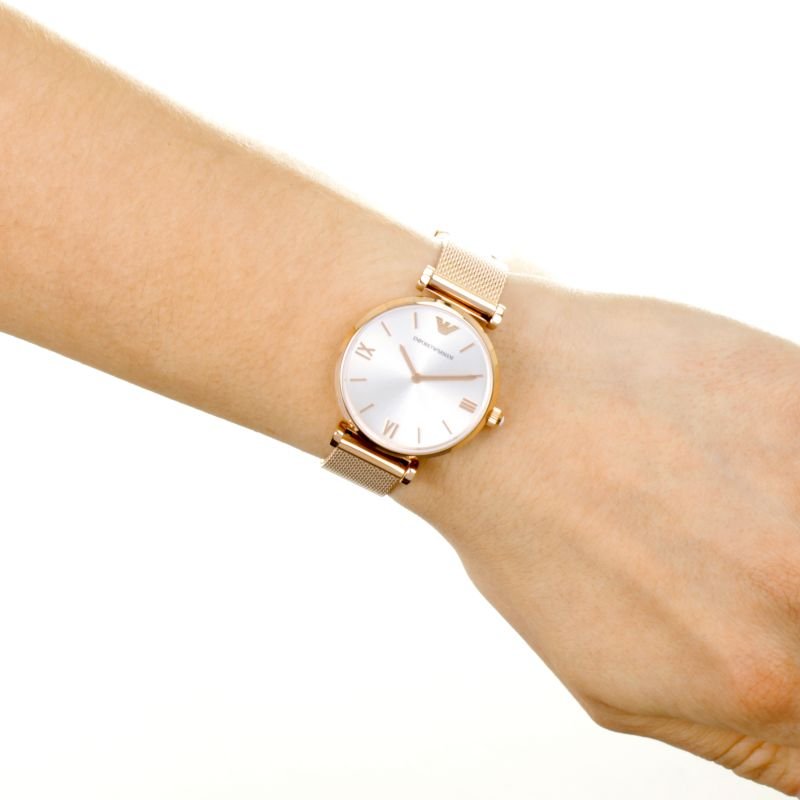 Emporio Armani AR1956 is an incredible interesting Ladies watch. Material of the case is PVD rose plating while the dial colour is Silver. This model has got 30 metres water resistancy – it can be worn in scenarios where it is likely to be splashed but not immersed in water. It can be worn while washing your hands and will be fine in rain. We ship it with an original box and a guarantee from the manufacturer.